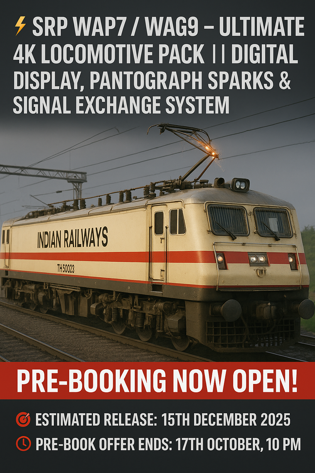 Pre-booking now open! 🚆 Get the SRP WAP7/WAG9 with 4K textures, digital display, pantograph sparks & signal exchange system.